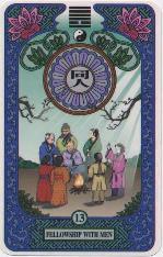 「同人」は、志を同じくすることです。六十四卦の中で、一陰と五陽の爻で成る卦は六卦ありますが、その一陰が柔順中正をしているのはこの卦だけです。全てにおいて、応じ、接しようとする陰陽の情ともとれる象が、同人を表します。上卦の乾は剛健不息の活動力、下卦の離は輝く知性。豊かな知性と実行力があり、広く柔軟な心を持っていることを表しています。そのような公明正大な心で広く信頼できる同志と手を結び、私利私欲を捨て偏ることなく親和していくことによって、目的が達成できるのだと、この卦は語っているのです。運勢的には一人で行うよりも共同で行う事が良い時で、偏愛することなく、公平な態度を守る時です。