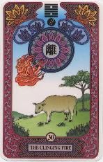 離とは、くっつき、そしてはなれるということです。離別、離散の離れる意と共に、附く、着くの意と、日、炎上する炎の性質から卦、爻、のことばがかけられているのです。上卦下卦共に離火で炎上の性質がありますが、火はなにものかにつき従うことではじめて炎上し、火としての特性を発揮します。私達のことにたとえますと、何につき従うかによって、吉凶わかれるものですから、感情任せ、自由奔放に付き従うことなく、冷静且つ慎重に正に従うこと(牝牛のように)亨通するのです。この卦の時は、感情的になりやすく、見こみ違いを起こしやすい時です。