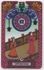 「けい」という字は変換しても出てこない特殊な漢字なので、ひらがなで書かせて頂いていますが、扁の「目」は「離」で、右側の「癸(みずのと)」は兌になります。前の卦、家人を逆さにしたのがこの卦で、家庭の不和、意見の食い違い、矛盾相剋を示しています。上卦の離は火の中女、下卦の兌は沢、少女。火は炎上し、水は下へ向かうので、お互いが正反対を目指し、志が合わず、陰気な睨み合いを表す、嫁姑の関係のような卦なのです。(姉妹や会社でのお局様と可愛い新入社員との関係もいえますよね)背く意味の卦に天水訟がありますが、こちらは男同士の公の背反で、けいの卦は内に反目と解されます。しかし、視点を変えてみますと、天と地は背反しつつ大きく交流し、男女も然り、むしろ背反しているが故に実は気になり引き合い、必要になるということが自然の摂理なのかもしれません。たとえ背いていても、同じ目的のために働かすことによって、用をなすことができるものなのです。また、背き合ってはいるものの、五爻と二爻は中爻において相応じあっています。小事吉というのはこのような応じ合い、補い合うところもあるからなのです。運勢的には、万事行き違いの多い時ですから、明智ある人の意見を尊重する時です。